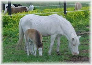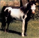 All Frame Overo horses carry the LWO gene. These genes are one and the same gene. If a Frame is bred to another Frame horse, there is a 25% chance of having a dead white foal. I will not knowingly breed a Frame to a Frame because of the heartache involved with a lethal white foal to both my family and to the mare. There is no such thing as a frame overo that does not carry the LWO gene. This is the story about the Sample herd as was copied to me by Dru of Dreamkaer Miniatures. It tells why Sample is considered a Van Lo horse: This story was told by Mrs. Lois Myler, wife of the late Vance Myler both of Van Lo’s Rainbow Ranch. Vance Myler passed away in 1994 and on my visit to Van Lo’s it was noticed that “Sample” appeared to be in a state of mourning. He had dropped in weight and his attitude was one of depression. After what appeared to be a period of a couple years the Old Man Sample, well into his 30’s miraculously came out of his depression and by 1997 his weight had returned and he was seen running through the Van Lo pasture once again. As the story goes Vance was at Art Kaltveldt’s home one day in Eastherville, Ia. when he spotted what he knew to be a most unusual marked little foal. Art was known for dealing with buying and auctioning ponies so the real background is lost but it is known that the sire and dam that Vance saw was then known as Judy a solid sorrel and Cocoa, a chocolate bald face stallion with two socks. Vance took the little guy home and raised him to be a beautiful, lively high two stepping pony who was identified by his apron face, bonnet, shield and dark hair down his back. Sample was what we know of today as a complete patterned “Frame Overo”. At the time both Vance and Lois lived about 90 miles from the Dakotas in a town called Spirit Lake, Ia. about 12 miles from Art. Sample was soon spotted by another one of Vance’s buddies and he offered to allow Vance pasture space over the winter if Vance would only allow him to keep Sample in with his two mares a buckskin and a black named Black Apache. The following spring two frame overo fillies were born. Black Apache’s filly was named Tadita and the other mares filly died fairly young. Vance brought home Sample and his first daughters were by Silverdale’s Dainty Denise known as Gypsy a black, Nipsy a black and Scarlet a bay. Another daughter was Nacona. Vance also ended up back at Art’s to bring home Tadita as she had foundered badly and Vance doctored her back to health by putting in hours of work and soaking Tadita’s hooves in old oil. As we can see today Tadita has had many beautiful overo foals into her upper years. One such son was the famous LTD’s Two Tone Trigger formerly owned and raised by Randy Weiner. Sample was bred to an own daughter to get Sandy, and Sandy was bred back to Sample again to get Wendy. Wendy crossed to Shredder produced Magic Man. Sandy was quite white with black flank spots, medicine hat and died at Margie Miller’s. Margie Miller at one point bought out some of the Myler mares in exchange for “Fame”. So Fame came home to the Myler’s once again. Fame was one of the loudest AMHA frames out of a Sample bred daughter. Fame was registered with AMHA at the last hour of its open Registry by Margie Miller and her frame son was bred to many of the Millers AMHA cross registered mares. A couple of other men who owned horses from the Van Lo herd were Gary Graham and Randy Weiner. When 18 of the Shelley Friesen herd, originally purchased from Van Lo’s were sold it was the two men who alternately bought the horses splitting the herd in two. In this group was Sample bred Gypsy, Funny Face, Nipsy, Scarlet, Angel, Judy and a Sample and Scarlet filly named Senorita, as well as several fillies and colts by Sample and Shorty. Also in the purchase was Dainty Denise used extensively in the Van Lo program. All of the Sample AMHR horses were placed in the Registry when it was opened. A breeder purchased the following Van Lo horses from Margie Miller of Sedalia, Mo. The white Wendy, Sandy, Concha, Sue Ellen and Elvira with coloring as follows: Wendy (see above picture), totally white except for a black pigmentation on her head Sandy, a reddish with flank florets, med. Hat, a lot of base white and cap was black. Sue Ellen, was a black and white pinto Elvira, was a bay roan Concha, was similar to Sandy but black florets, cap etc. Rolling Green Red Crescent King was used as a back-up and was not used for the AMHR stock. The original classic breeding stock was Star Attraction and two hackney mares, Misty and Bobbie purchased from Bob Jones.There is a large scrapbook of Vance's life in pictures and education with memories at the website: htttp://www.millersequine.com |